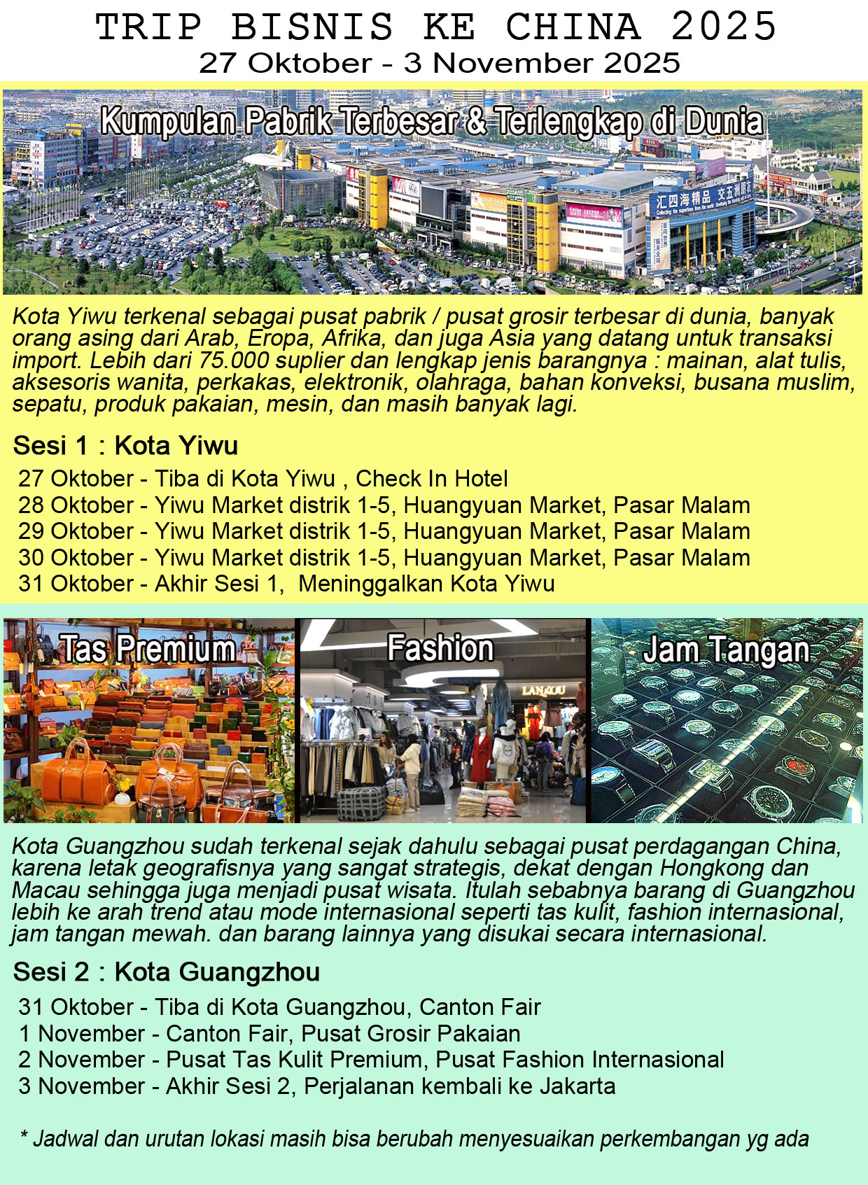 * Tour ini adalah tour spesial (tidak sama dengan tour wisata biasa) yang mementingkan anda mendapatkan barang yang tepat dengan harga terbaik dan diuruskan segala keribetan pengiriman perpajakan dan bea-cukai dan anda terima bersih barangnya sampai di tangan anda di Indonesia, bahkan proses pengiriman bisa diulang tanpa harus ikut tour lagi, jadi bisa kulakan sesering yang anda mau tanpa ada tambahan biaya. Banyak tour yang mirip dengan harga yang lebih murah tetapi ternyata pembimbing tour bahkan tidak bisa Bahasa Mandarin sehingga proses mencari barang terhambat dan bahkan terkena penipuan, kemudian barang juga banyak yang ditahan di bea cukai dan anda diminta mengurus sendiri. Mohon lihat reputasi profil dan rekam jejak (dokumentasi foto) dari penyelenggara tour agar anda tidak kecewa.
