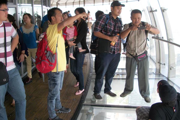 Saling berfoto di Pearl Tower Shanghai, seakan-akan melayang di udara.
