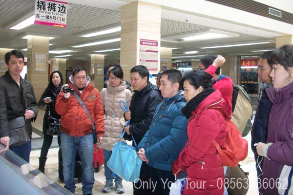 (atas : Arif di depan pintu utama distrik 2 ; bawah : Anny dan peserta di hall Huangyuan Garment Market)