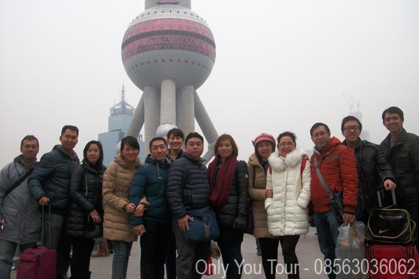 Berfoto bersama di depan ikon kota Shanghai yaitu Oriental Pearl Tower.